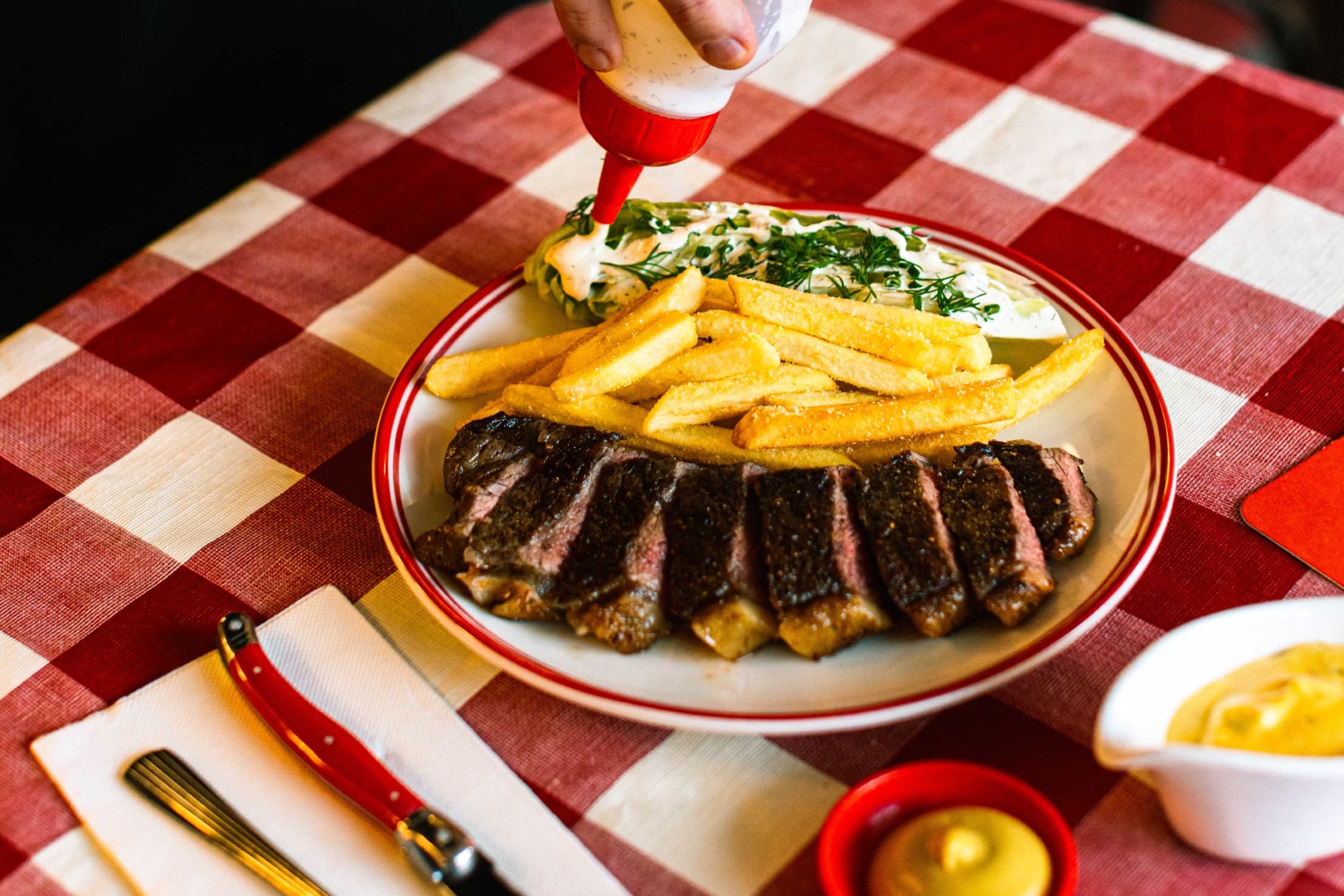 For the main course, order steak frites with béarnaise sauce, chips, and a mini wedge salad, and a bottle of Stéphane Aviron gamay.