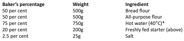 *As of this writing, I am baking in Copenhagen, and the specifics of this recipe reflect those climatic conditions. The temperatures listed here are for bakers working in temperate climates. If you’re in a very hot place, the water should be cooler (30°C), to avoid speeding up fermentation too much. Otherwise, the temperature of the hot water (40°C) is perfect because once you’ve added all your other ingredients, the temperature of the dough will be around where you want it, 30°C.